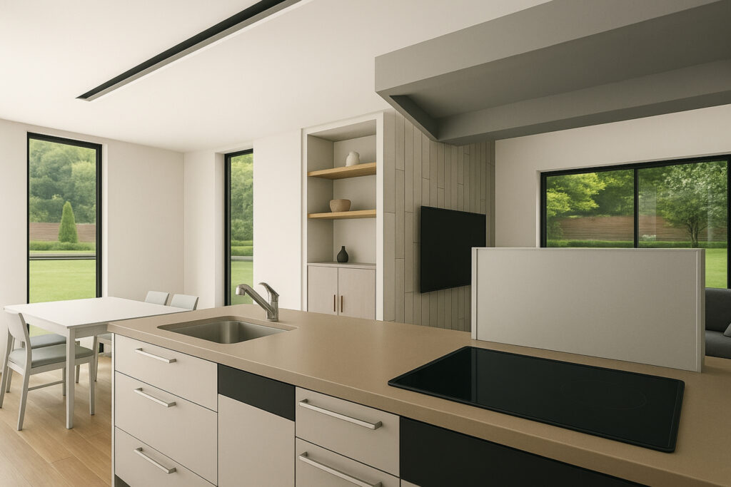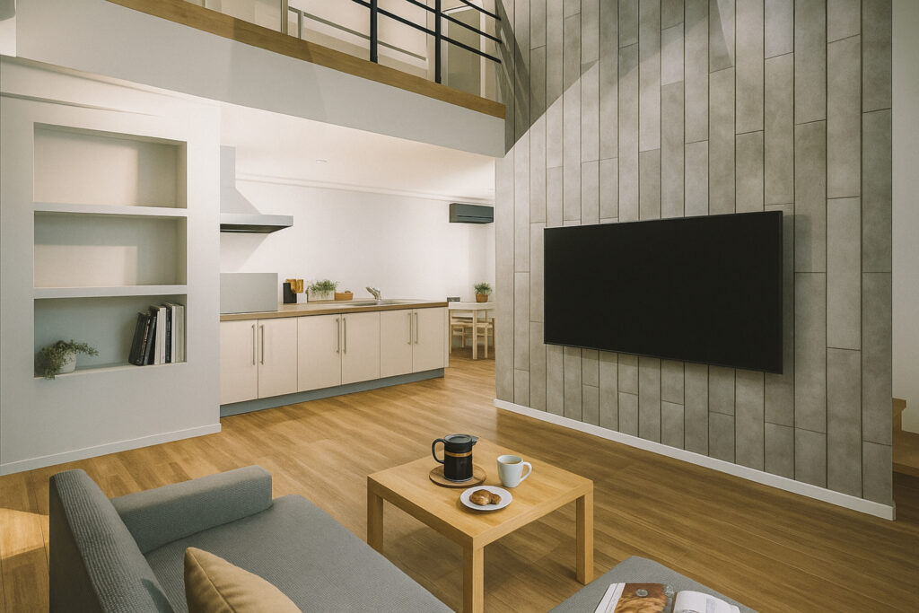 スタイリッシュでデザイン性の高い空間です。自然な風合いの素材感が、家族が集うメイン空間に上質な雰囲気を加えます。