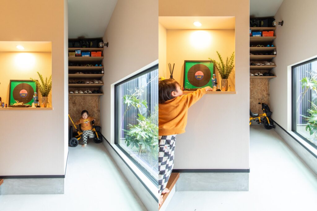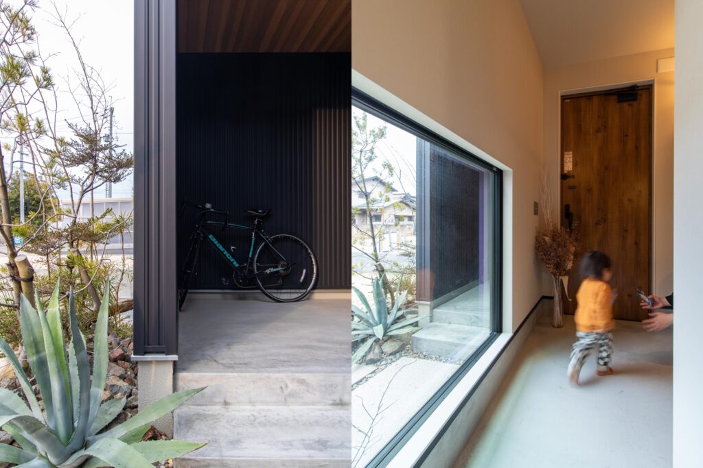 また、玄関土間は外と内をゆるやかにつなぐ場所として広めに取り、大きなフィックス窓から光が入る設計にしています。