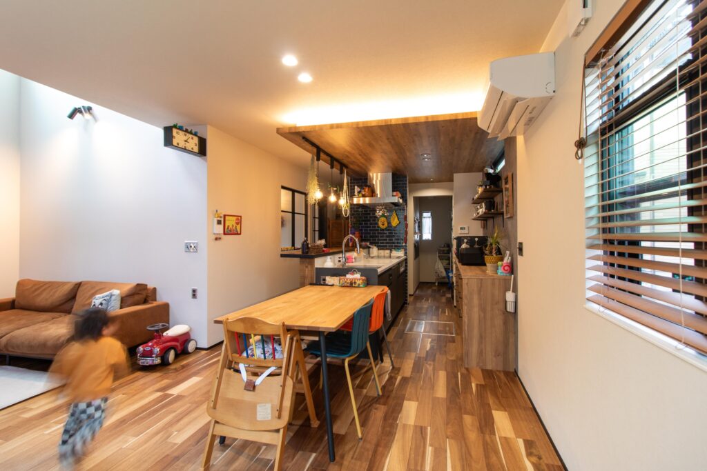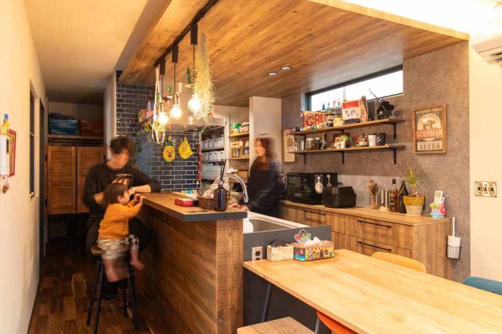 料理をするだけの場所ではなく、カウンターに腰掛けて会話をしたり、お子さまが遊んでいる様子を見守れたりと、家族の時間が自然に重なるよう計画しています。