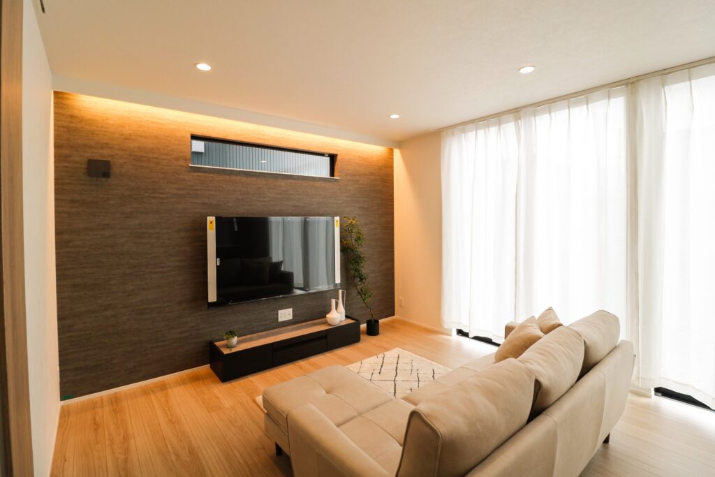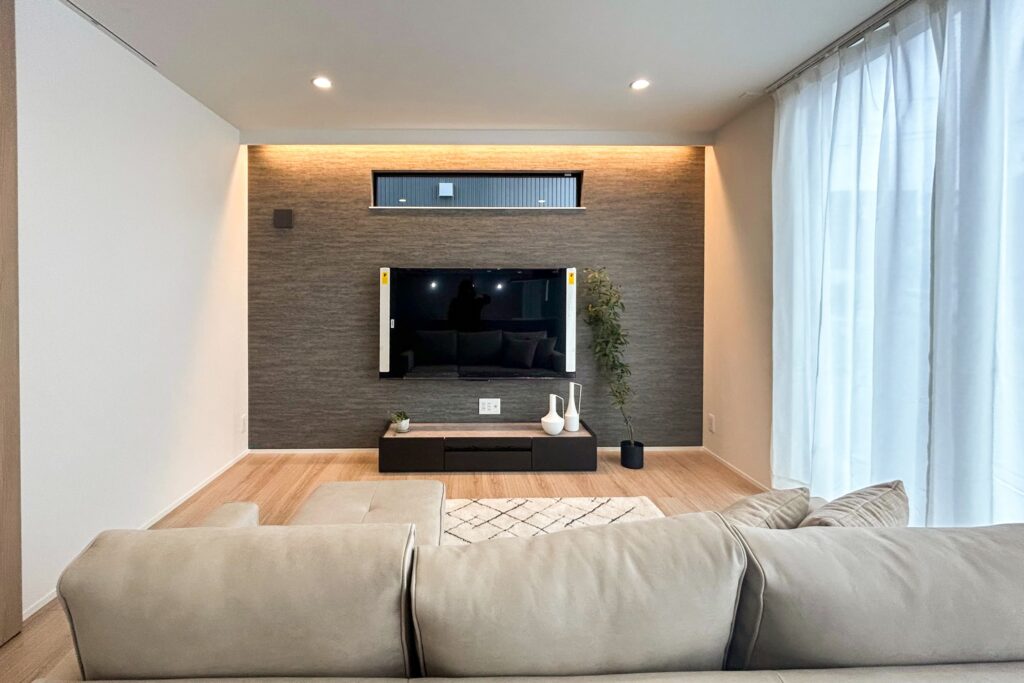 テレビ面はアクセントと間接照明で華やかに。