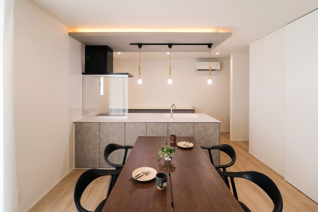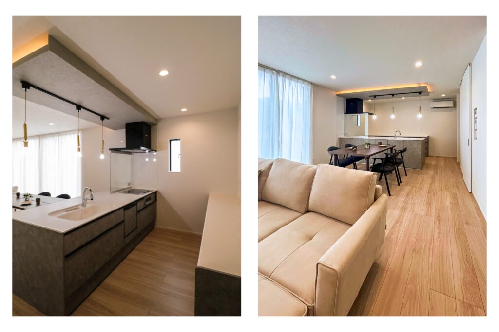 モルタルデザインのキッチンと、下り天井のデザインもキッチンに合わせて。