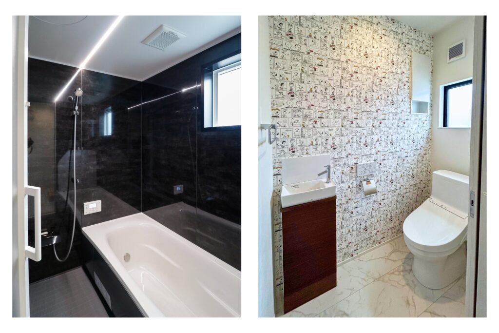 トイレのクロスは、SNOOPY柄で遊び心をプラス。